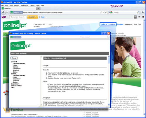 After you log in to the OnlineIPT system, click on the "Help and Training" link at the top of the OnlineIPT web page. This section will assist users with database set up, login, test administration, scoring, and reporting.